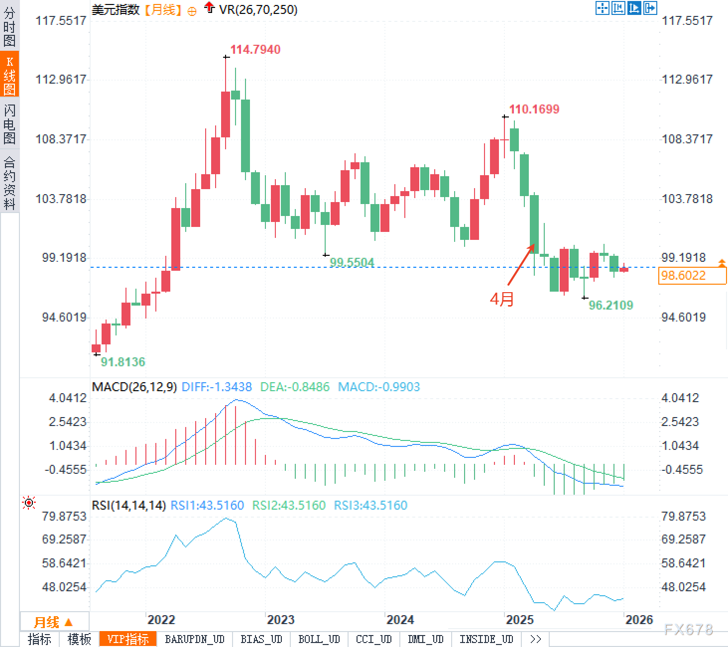 把时间拉长到月线级别来看,美元指数在2025年4月经历大幅下挫后,并未延续单边下跌,而是逐步转入区间震荡。当前美元指数已基本回到4月低点附近,显示出市场已完成一轮较为充分的仓位出清。