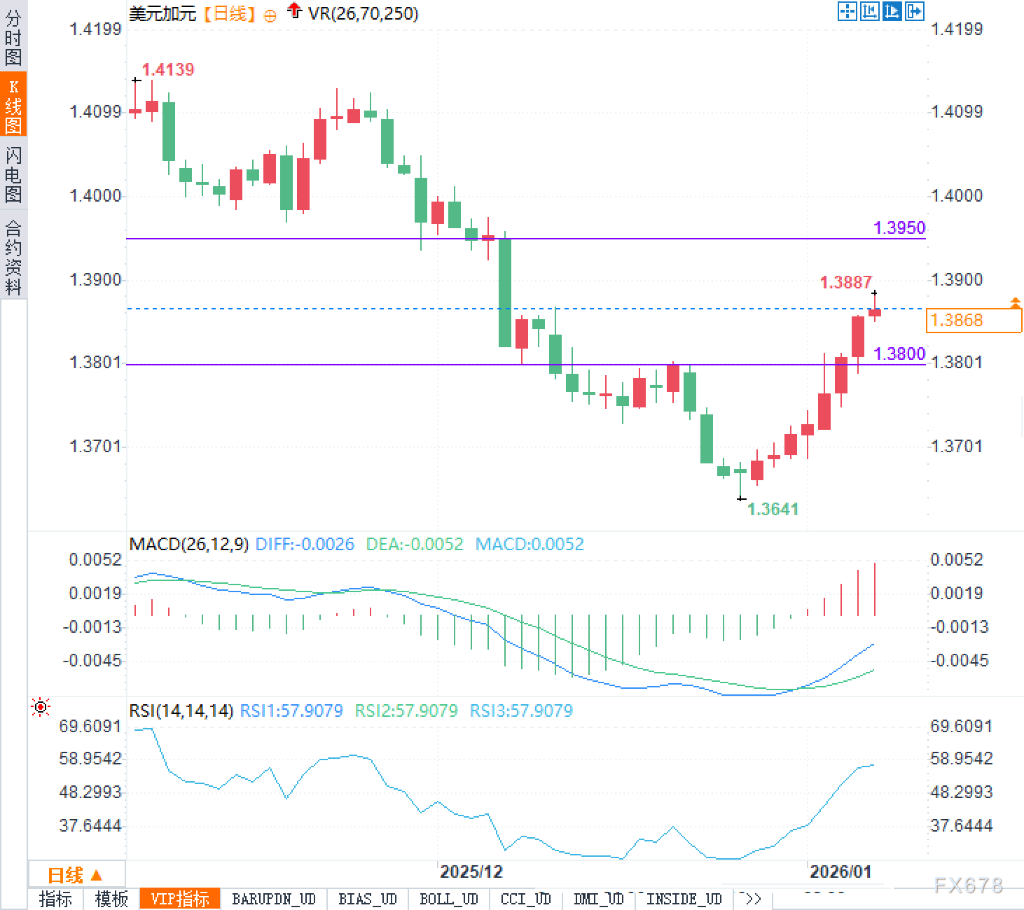 从日线K线图看,美元兑加元在经历一段清晰的下降趋势后出现技术性反弹:高点从1.4139一线回落并加速下挫,最低触及1.3641后企稳回升,当前回到1.3870附近。结构上,1.3800是近期最关键的水平支撑与多空分界:此前跌破后形成一段盘整市场,当前重新站回该位,意味着空头动能阶段性衰减,但要将反弹从“修复”升级为“趋势反转”,仍需有效突破上方1.3950阻力线并完成回测确认。短线观察到1.3887附近存在近端压制,若反弹在该区域反复受阻,易形成箱体内的震荡与回撤;若放量式突破并站稳,则上方1.3950将成为下一道“价格磁力位”,突破失败则可能演化为假突破并回落考验1.3800。