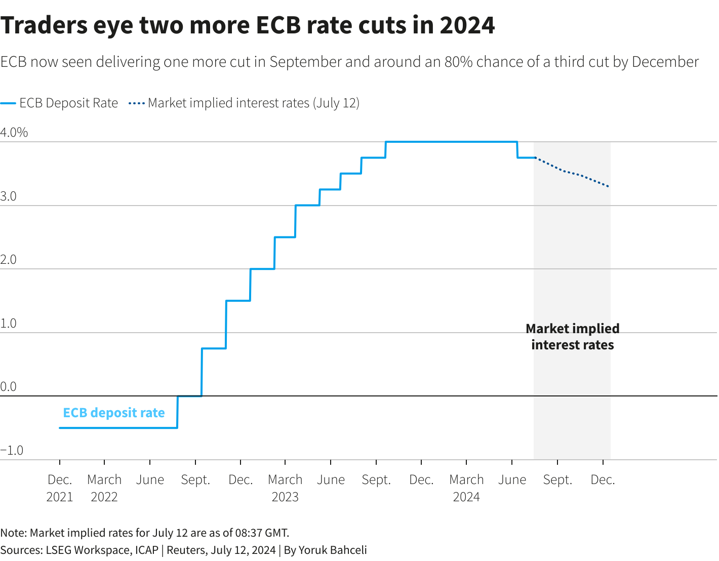 交易员们预计欧洲央行今年将再次降息,最有可能在9月份,而到12月份第三次降息的可能性为80%。