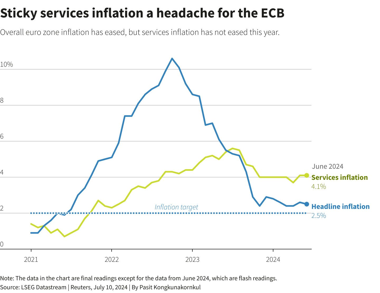 6月份,欧元区通胀率三个月来首次回落至2.5%。但服务业的失业率上升到了4.1%,而且今年以来一直没有下降。服务业占通胀篮子的近50%,因此政策制定者希望看到通胀下降,以对通胀回归目标有信心。