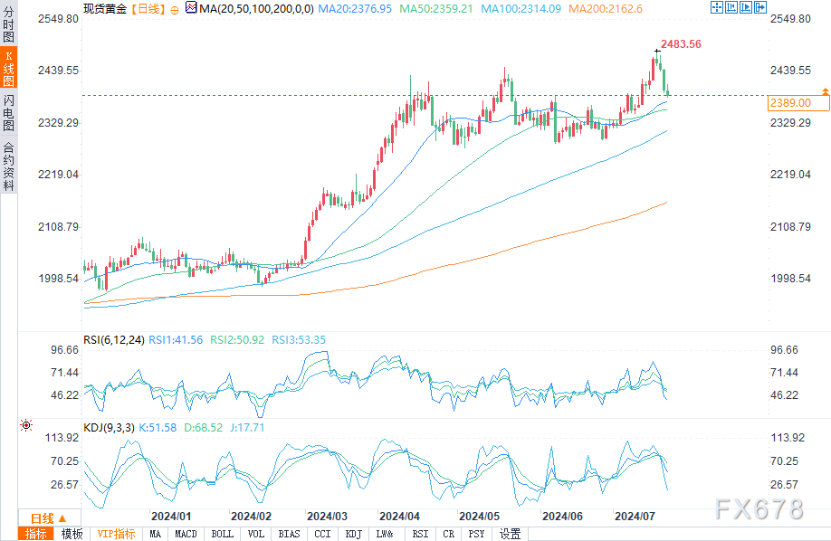 周一(7月22日)美市中,金价失守2390美元关口,尽管由于美国总统乔·拜登决定退出 2024 年总统竞选,导致美元走弱。同时市场准备等待周五公布的美国个人消费支出 (PCE) 数据,以进一步寻找降息时机的线索。