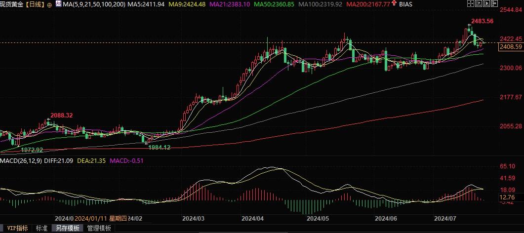 北京时间7月24日9:22,现货黄金报2408.47美元/盎司