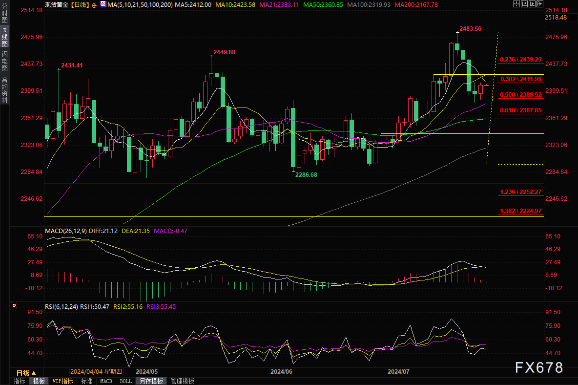 Valencia称,要想继续看涨,金价需要攻克2412美元/盎司。一旦突破该位,金价下一个阻力位将是2450美元/盎司,然后再挑战历史高点2483美元/盎司。