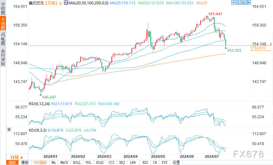 周三(7月24日)美盘时段,美元/日元盘中报154.022/033,跌幅0.99%。