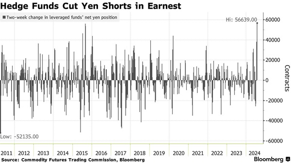 美国商品期货交易委员会(CFTC)的数据显示,截至7月23日的两周内,杠杆投资者削减56,639份日元净空头头寸,这是自2011年初以来规模最大的一次。