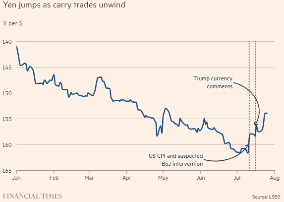 7 月份,截至目前,日元兑美元汇率上涨了 4.7%,这得益于日本央行周三(7月31日)可能加息,从而缩小了与美联储之间的巨大利率差距,此前这一差距曾导致日元跌至数十年来的低点。本月早些时候,随着美国通胀率下降,美联储降息的预期也随之升温。