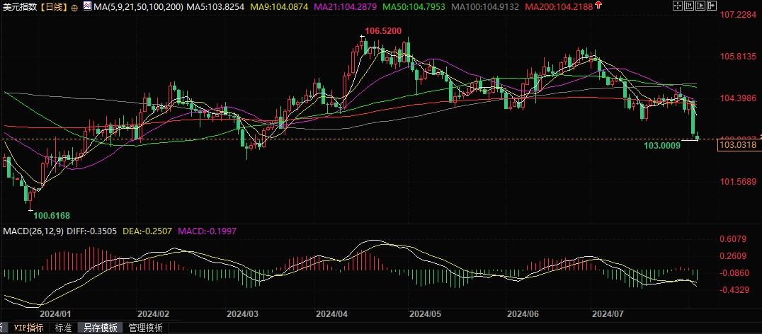 北京时间8月5日9:18,美元指数报103.03