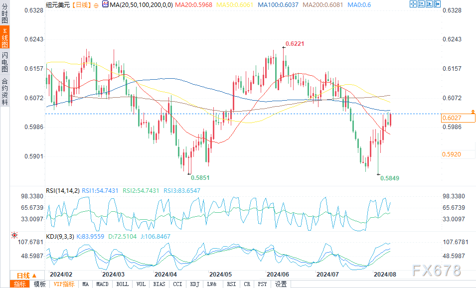 周一(8月12日)欧盘时段,纽元/美元稳步走高,盘中报0.6026,涨幅0.48%。