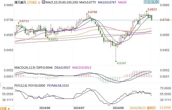 周一(9月2日),澳元/美元回升0.4%,收盘于0.6790,澳元走势颇显韧性。目前市场焦点都在本周即将公布的美国非农数据,数据将会影响到市场对于美联储是降息25还是50个基点的预期。如果美国就业市场也显示美国经济完全处于软着陆的景象,那么美联储的降息将会以温和防御性的节奏展开。若如此,美元料将会从中得到支撑,而澳元将会承压。若美国就业数据呈现的是继续疲软的场景,则澳元有望继续向高点冲击。日线图上,21日波林格区间收缩,10日和21日移动均线攀升,动能指标处于高位整体看多。澳元若要继续上升需要尽快收于8月高点0.6824以上。目前周五低点0.6752和8月22日低点0.6697是初步支撑位。若都失守,澳元/美元转跌风险变大。