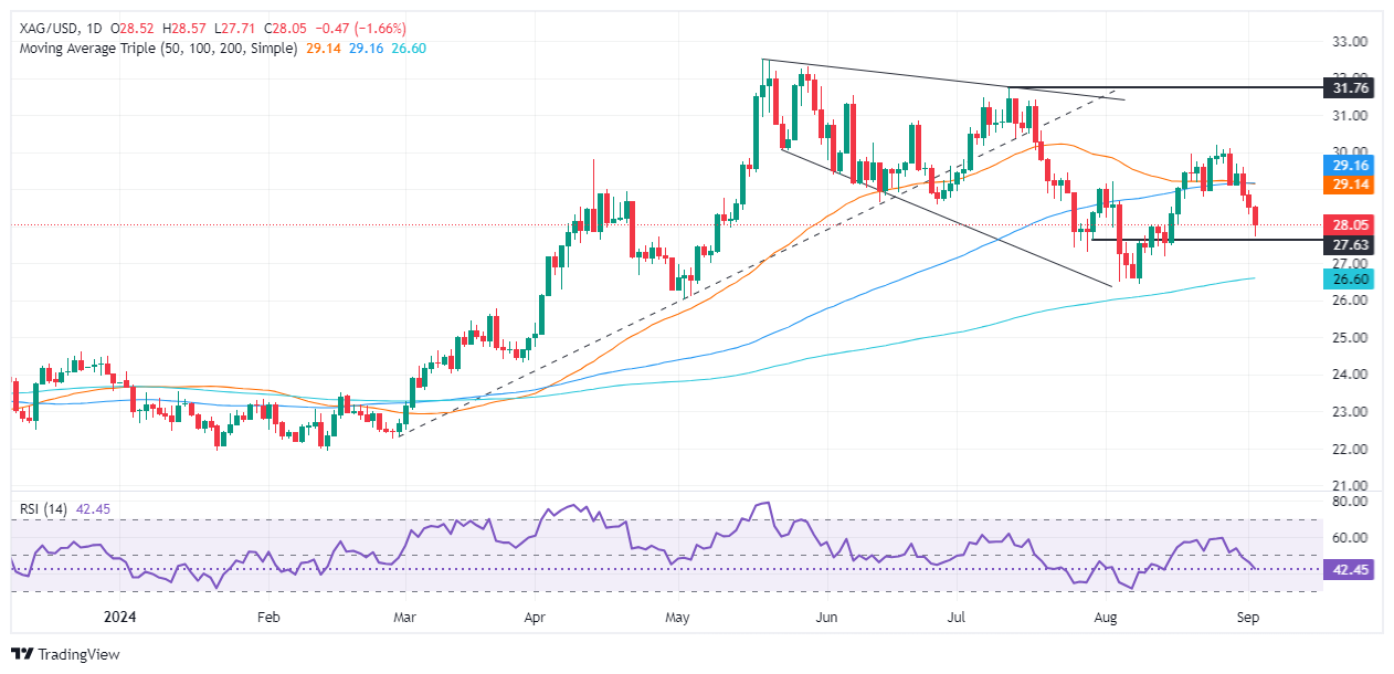 周三(9月4日)亚市盘中,现货白银在昨日大跌后延续跌势,目前银价已经跌破重要关口28.00美元/盎司。FXStreet分析师Christian Borjon Valencia撰文,对银价技术走势进行分析。