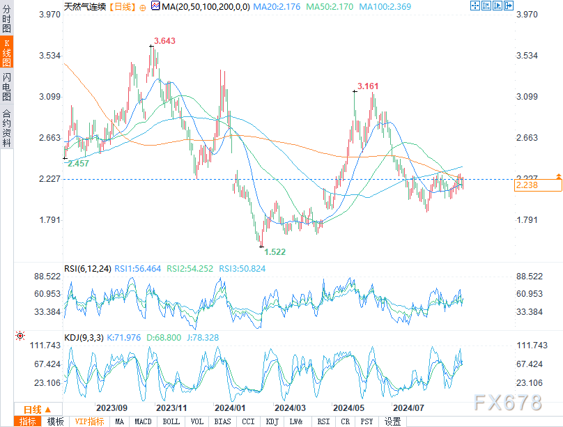 北京时间02:19,美国天然气报2.243美元/百万英热,涨幅3.36%。