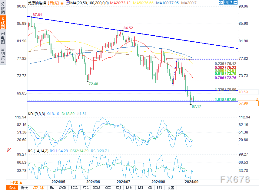 上周五,67.11美元的关键水平被短暂突破。目前,67.11美元和68.00美元之间的区间值得关注。下一个水平是64.38美元,这是2023年3月和5月以来的低点。