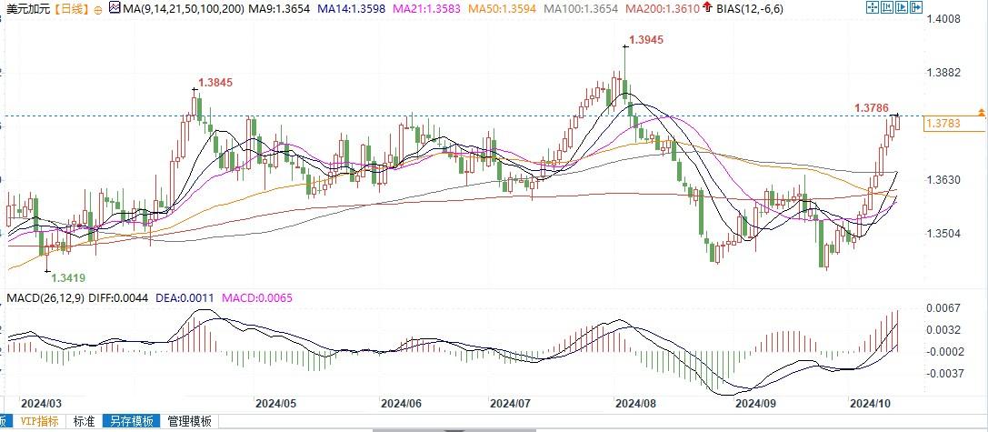 北京时间10月14日9:15,美元兑加元报1.3782/84