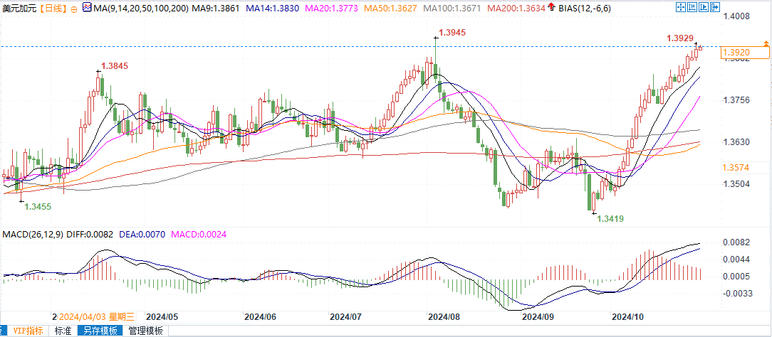 北京时间10月30日13:44,美元兑加元报1.3919/21