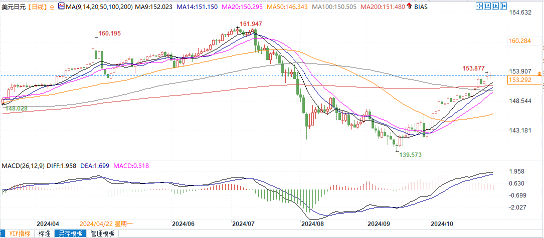 北京时间10月30日11:00,美元兑日元报153.31/33