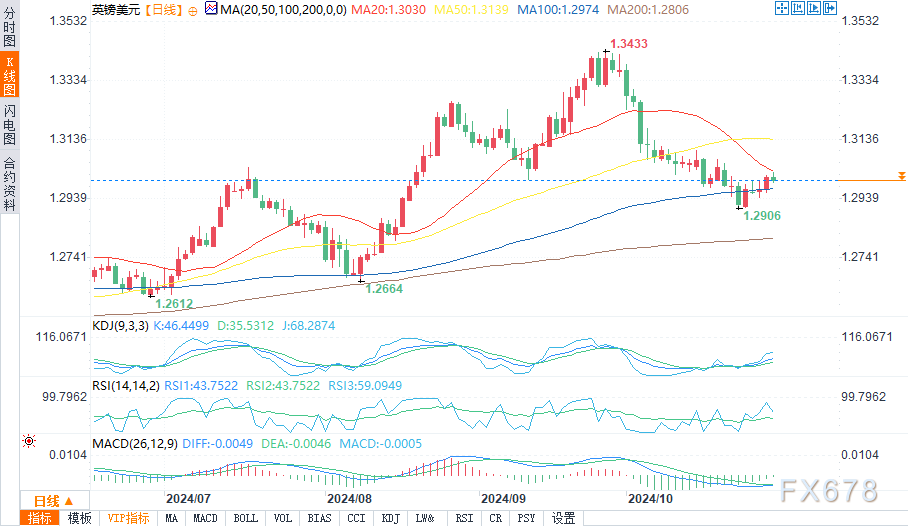 周三(10月30日)欧盘时段,英镑/美元盘中交投于1.3000附近,跌幅0.11%。
