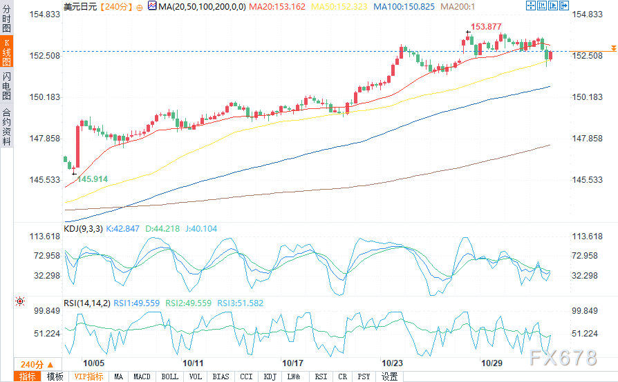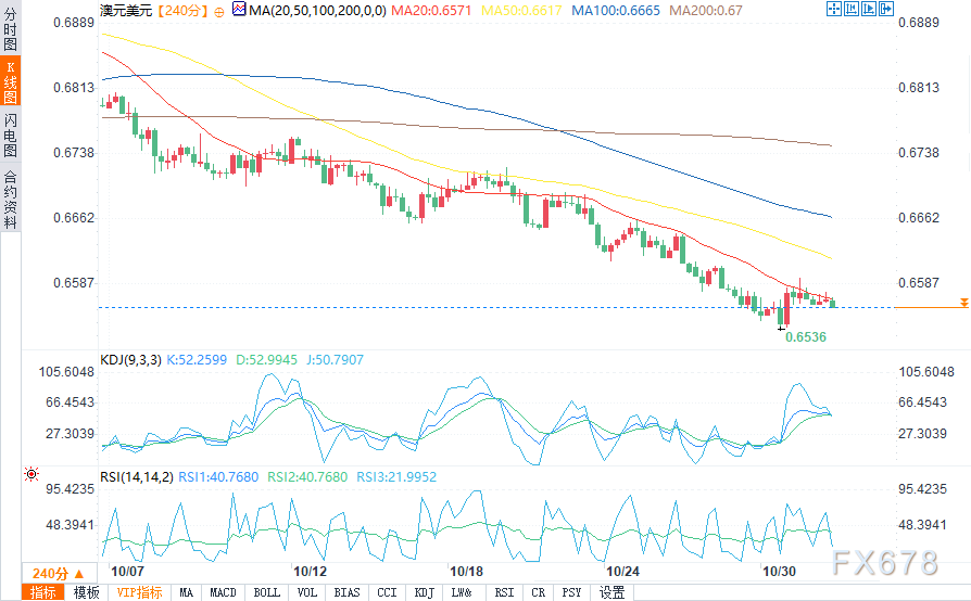 周四(10月31日)欧盘时段,美元指数在狭窄区别波动,盘中报104.0477,跌幅0.07%。以下是对美元/日元、欧元/美元、澳元/美元、纽元/美元几组货币对的技术分析。