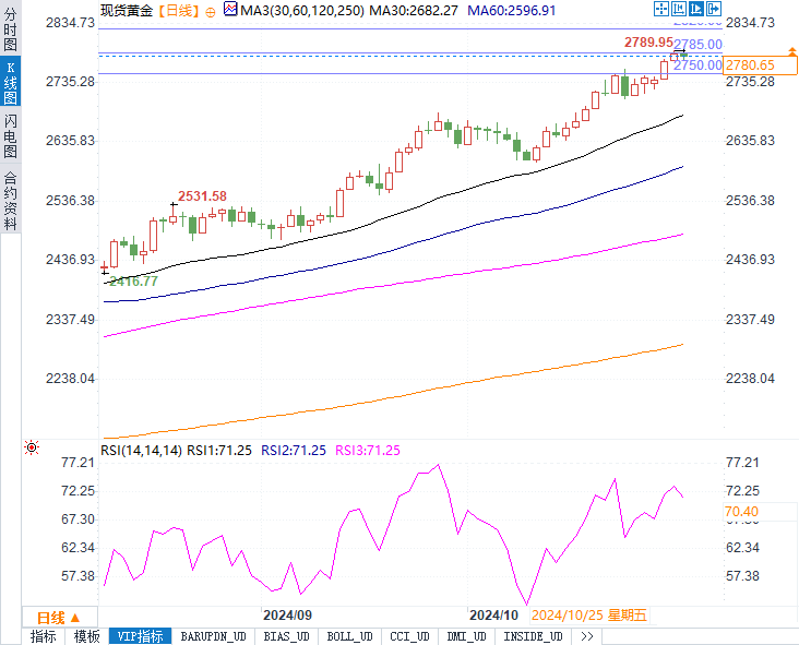 今日,现货黄金价格攀升至2780美元每盎司,本月累计上涨6%,仅距2800美元关口一步之遥。地缘政治的不确定性,特别是美国总统选举的临近及全球央行的鸽派态度,加剧了市场避险情绪,助推金价上涨。同时,美联储的货币宽松政策为黄金提供了强大支撑。