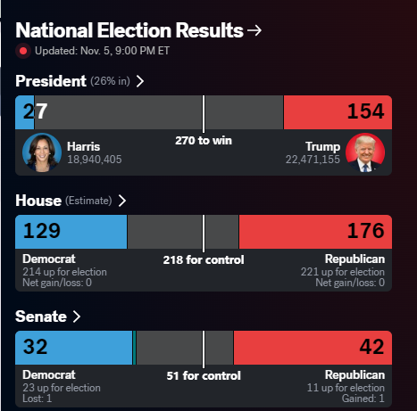 Edison Research预测,特朗普已拿下八个州,而哈里斯则赢得了三个州和华盛顿特区。初步开票结果正如预期的那样,预计胜负关键将在七个摇摆州。