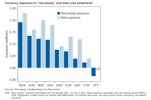 他表示:“典型的‘高贝塔’(high beta)货币(挪威克朗、澳元、纽元、瑞典克朗)对‘特朗普交易’的风险敞口很高。”