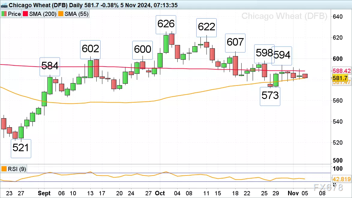 在55日移动均线和10月22日的低点581.5- 579之间可以找到较小的支撑,在此之下的支撑位在10月低点573。如果价格进一步下跌,将受到至9月9日低点564的支撑。