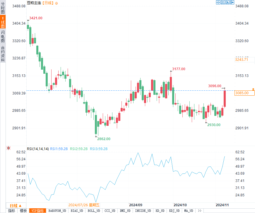 今日早盘豆粕表现抢眼,连涨3.35%,受美元汇率上涨及关税担忧影响,国内对进口大豆的依赖度提高。国泰君安指出,特朗普胜选对豆粕盘面带来了偏强支撑,豆粕价格从大选落定后便进入强势上涨通道。美豆出口预期因美元强势受限,而国内因进口成本上升走强,推动豆粕一举走出独立行情,预计豆粕01合约将保持强势。