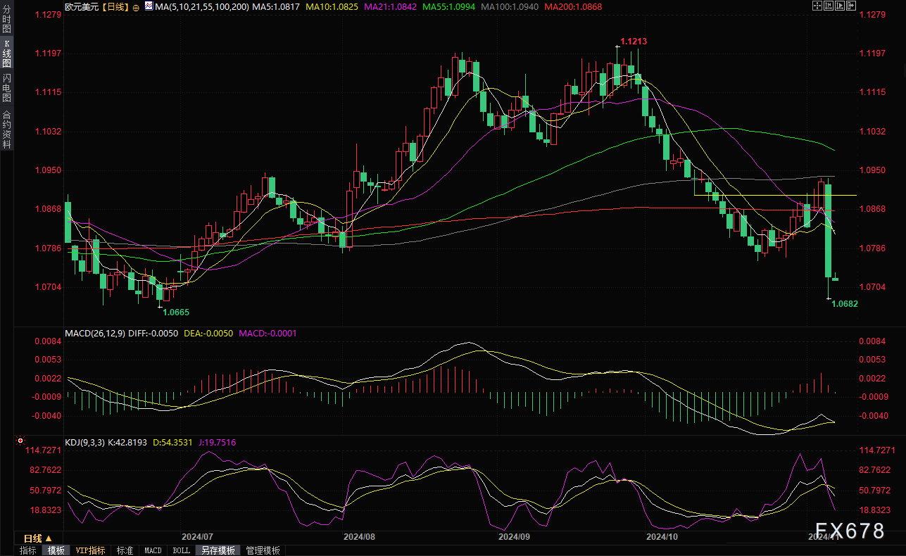 周四(11月7日)亚市,欧元/美元小幅企稳,目前交投于1.0723附近。欧元上日重挫1.8%,盘中最低触及1.0683美元,为6月27日以来最低,因美元指数大涨1.7%,且美债收益率劲升。