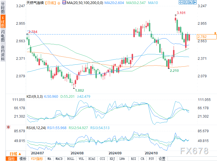 周三(11月6日)美盘时段,美国天然气价格小幅上涨。在这个时间点上,值得注意的是50日均线下方应该是支撑位。在2.50美元有更强的支撑,因为这是一个很大心理关口。在此之下有200日移动均线支撑。天然气下方存在很大的买入压力。如果在这个关键时刻反弹,那么3.15美元可能是短期内的上限,这个价格水平在过去多次显示出重要性。