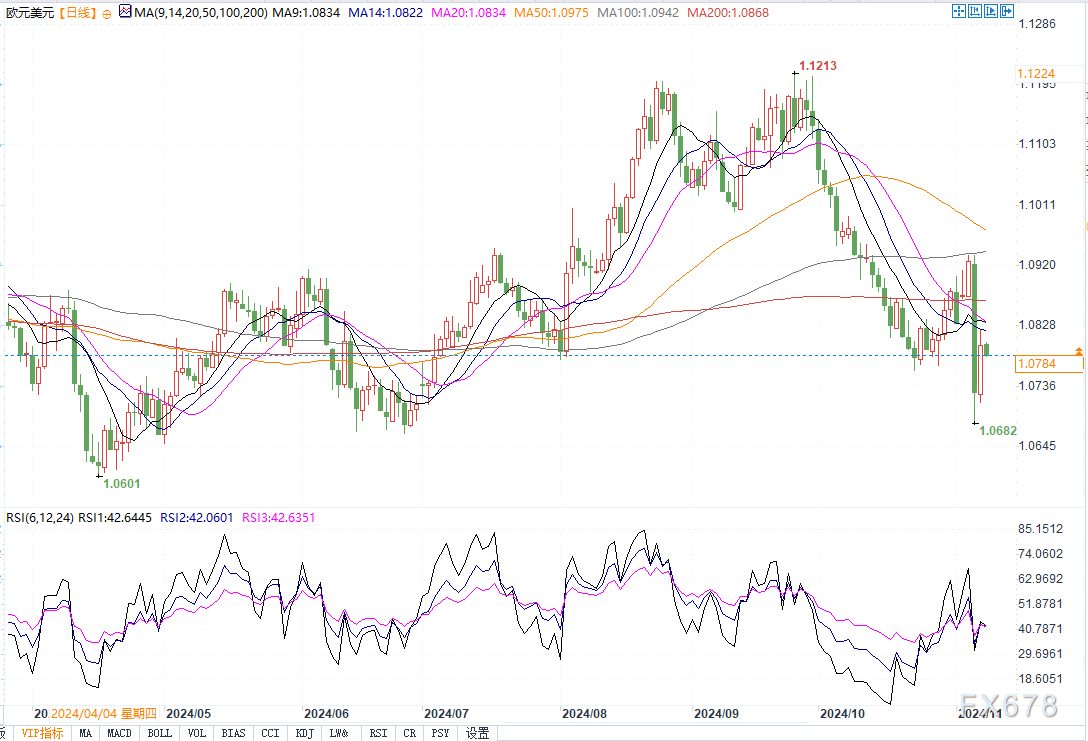 北京时间11月8日9:25,欧元兑美元报1.0782/83