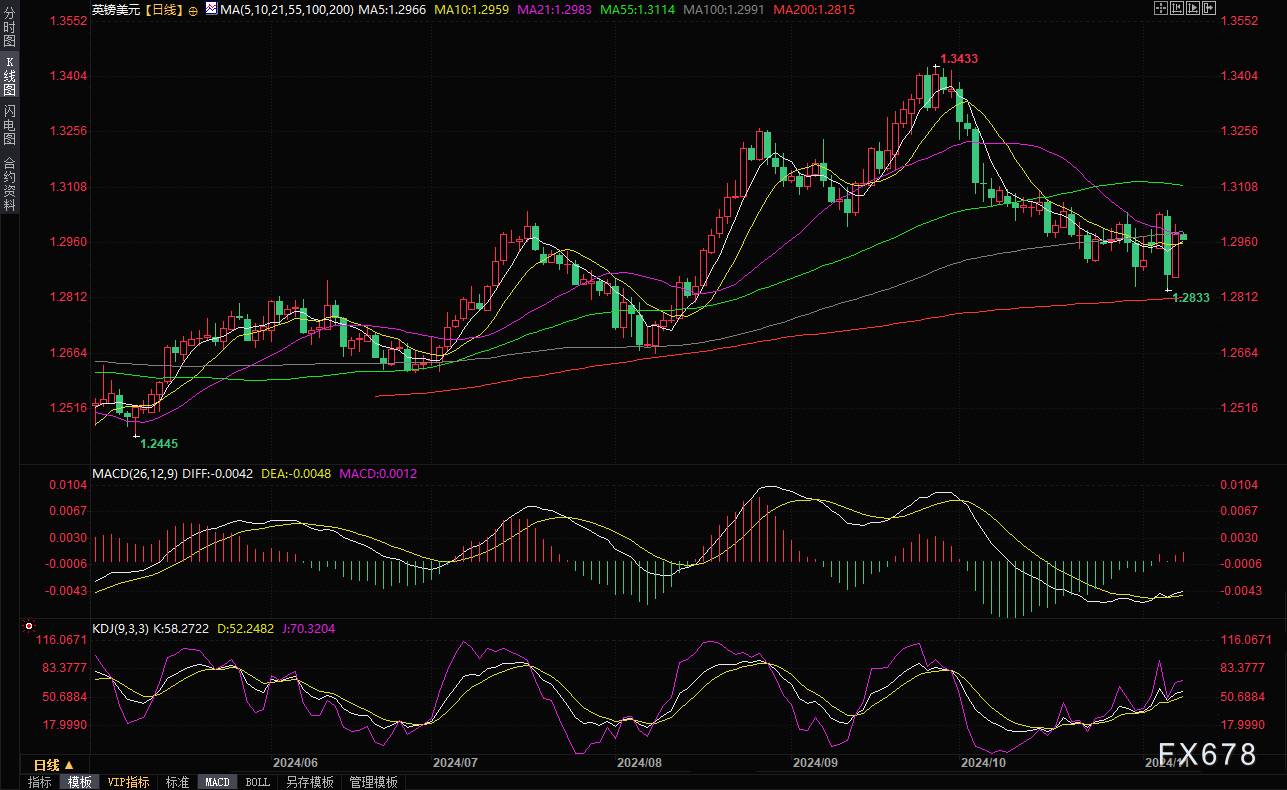 周五(11月8日)亚市早盘,英镑兑美元震荡微跌,目前交投于1.2970附近,受到1.30关口压制。英镑兑美元周三收涨0.85%后持稳,收报1.2985,因美元下跌0.75%。