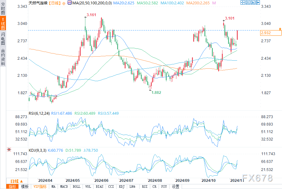周一(11月11日)美盘时段,天然气期货价格大幅上涨,盘中涨幅9.52%。这证实了上周一收盘价在2.514美元的底部反转,但尚未将更广泛的趋势转向上行。期货目前交投于关键支点2.825美元上方,该支点若能维持,可能成为支撑位。近期交易区间定义为3.136美元至2.514美元,技术指标显示,如果天然气期货价格持续升穿2.825美元,可能会引导天然气价格走向下一个关键轴心水平3.044美元。