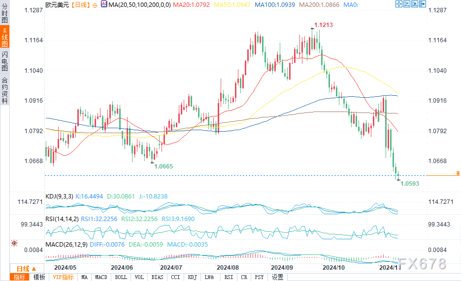 由于美元持续升值,欧元兑美元继续下滑至7个月低点,4月低点1.0602正在受到测试。跌破这一水平将触及2023年11月的低点1.0517。
