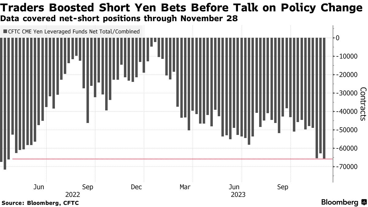 根据美国商品期货交易委员会(CFTC)的数据,截至11月28日一周,杠杆基金将其对日元的净空头头寸增加到65,611份合同,为2022年4月以来最高水平。