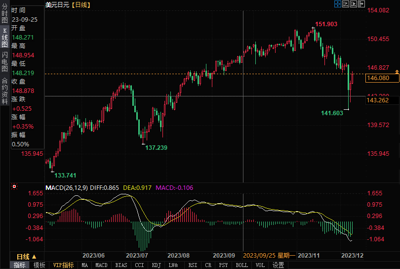142.85是美元/日元由137.25升至151.92的61.8%回档位。