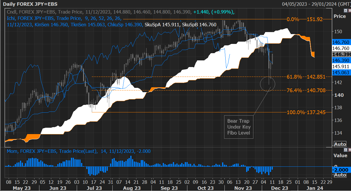 美元/日元预计将回升至基准线,目前该线在146.76。美元/日元未能收于142.85费波纳奇位下方,形成一个“空头陷阱”。