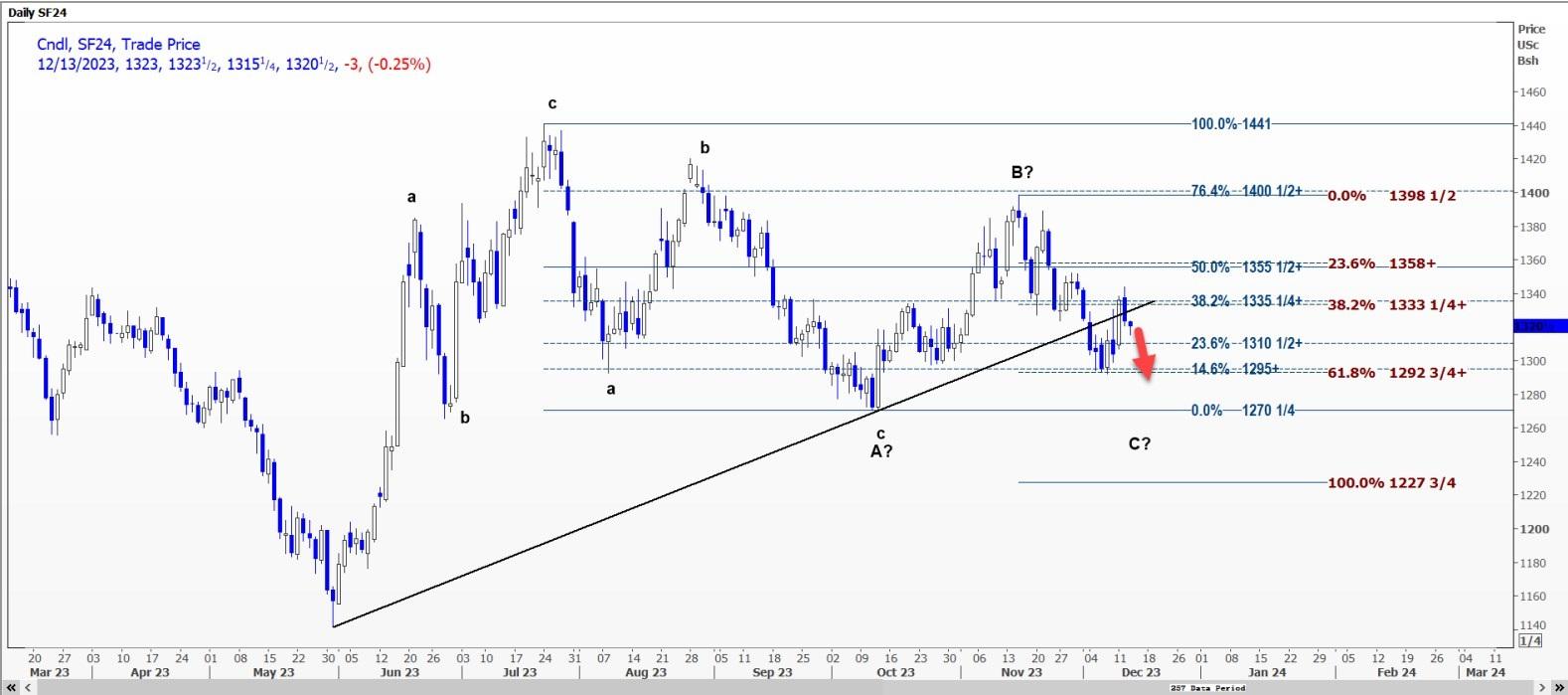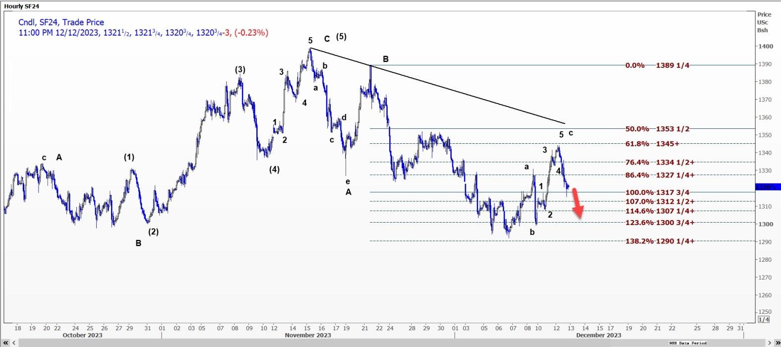 随着从12月7日低点12.92美元的反弹完成,CBOT大豆1月合约SF24可能进一步下滑至每蒲式耳13.0075美元至13.0725美元的区间。
