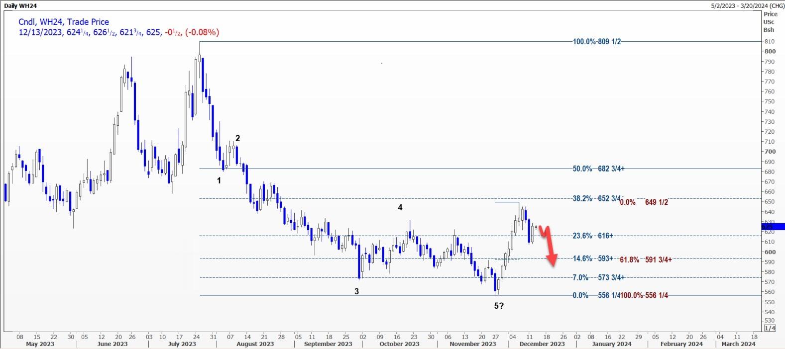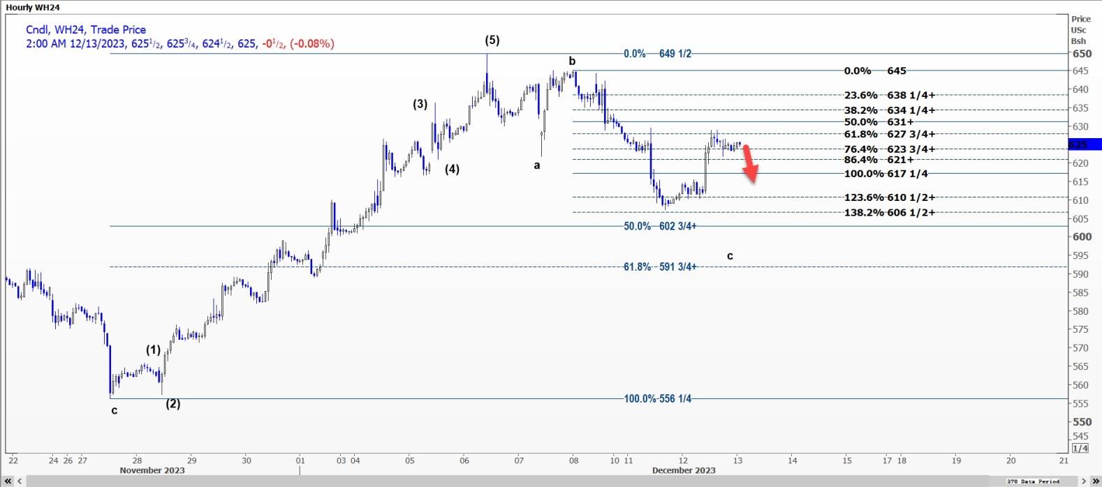 CBOT 3月小麦WH24可能会跌至每蒲式耳6.1050美元至6.1725美元之间,因为其从6.4950美元的修正看起来并不完整。