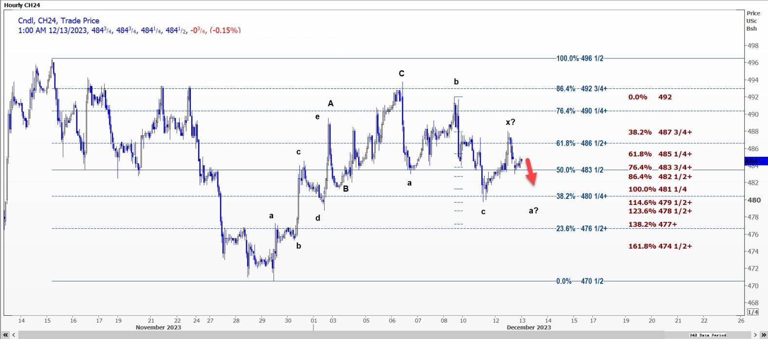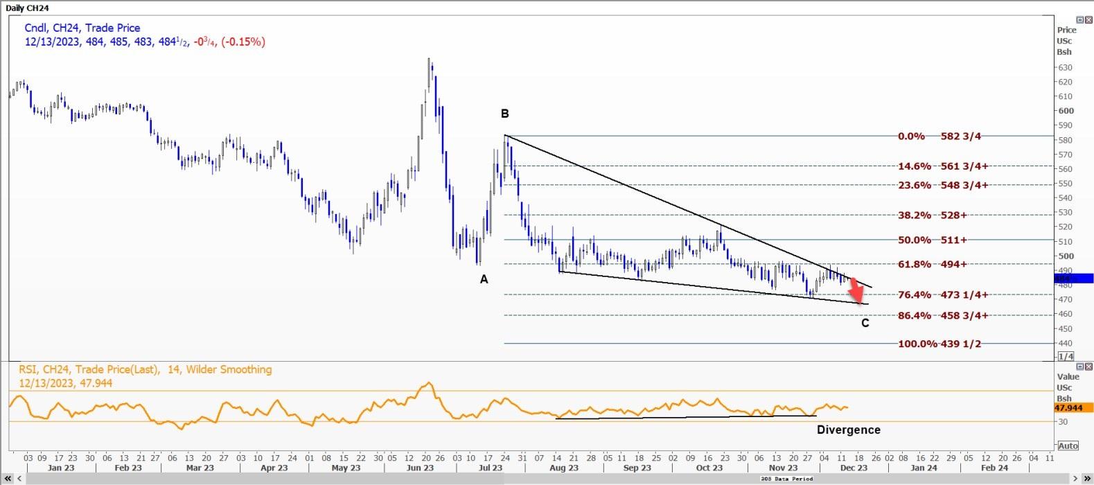 CBOT 3月玉米CH24可能会重新测试每蒲式耳4.8350美元的支撑位,跌破该支撑位可能会确认4.8125美元至4.8250美元的目标区间。