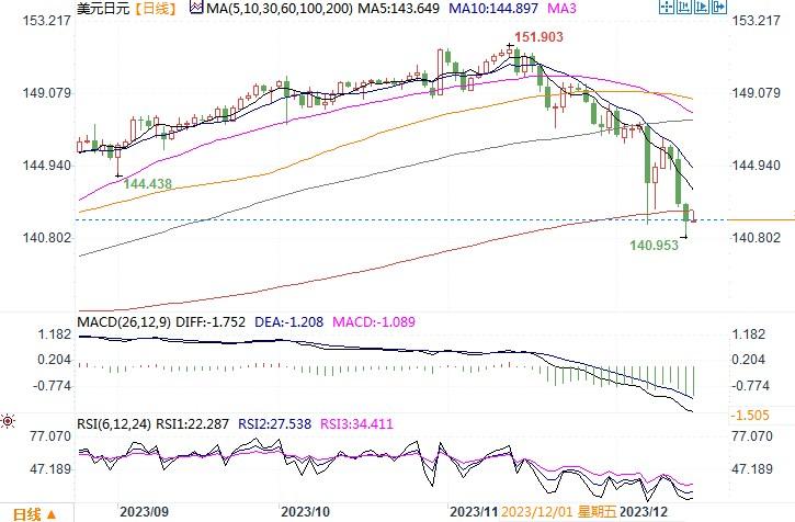 周四(12月14),英国和欧盟央行虽然也继续维持利率不变,也提出本轮利率加息周期已结束,但强调暂时还没有理由急于转向限制性较弱的政策,欧洲央行和英国央行更倾向有必要在更长时间内维持较高利率。英国和欧洲央行这种利率决议态度,给到美元压力,美元全面下跌。美元兑日元纽约盘尾下跌0.68%,收盘在141.87,日内最低曾触及7月31日以来最低140.94水平。本周美联储在今后利率走向问题上意外明确表露鸽派,使美元深受打击下行。下周,日本央行也将召开利率会议。会议上结束负利率的预期已在很大程度上有所下降,但市场还是希望该央行可能会对其声明进行调整,例如调整如有必要,将毫不犹豫地结束放宽政策的措辞。如果会议上有类似的消息传出,则会被视为“向正常化迈出的一步。那么日元或会因此继续获得支持而走升。但是也要防范日本央行意外发出希望继续维持甚至加大宽松的措辞,从而导致日元回软。目前,短线小时图上美元/日元进入超卖回补调整节奏。而日线图上,美元/日元近一个多月以来形成的下跌通道在继续延展之中,技术指标也未显示美元空头动能衰竭。短线的回补修复只要受限于143之下,那么该货币对仍有望下探140水平。