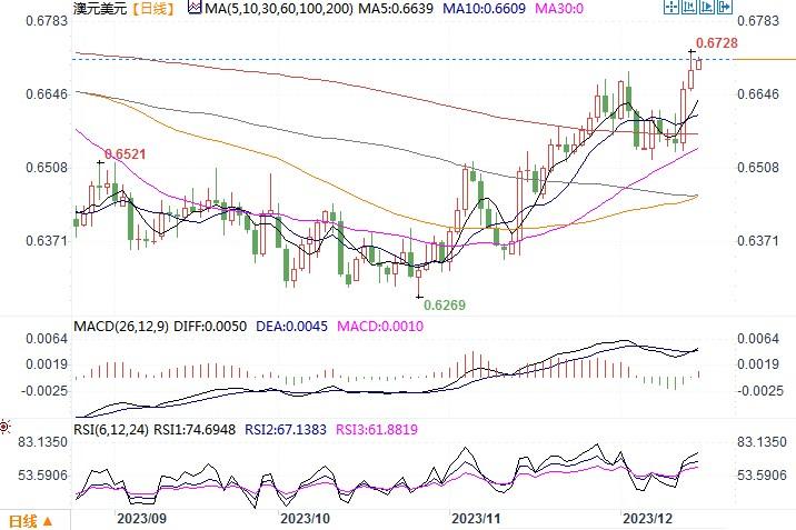周四(12月14日),隔夜英国和欧洲央行在货币政策上希望维持当前高利率更长一段时间的鹰派态度,打击了美元,而澳元兑美元也是受益上涨触及0.6728美元的逾四个月最高。此前数据显示, 11月澳洲国内净就业人数增加6.15万人,而市场此前预测的增幅为1.1万人左右,澳洲11月的就业人数连续第二个月远超预期。就业市场的紧俏,可能会稍稍减弱市场认为澳联储明年年中将会降息的看法。这给澳元带来了额外的推动力。而且即便期货市场预期澳元2024年全年降息幅度将略多于50个基点,但这与美联储153个基点的降息幅度相比就显得微不足道了。日线图上,澳元/美元上挺至布林带通道上轨线,布林带喇叭口有重新扩张态势,技术指标转呈上扬趋向,显示澳元多头力量增强。澳元/美元有可能借着本周欧美主要经济体利率决议态度的分化影响,继续受益上行。下方只有跌穿强支撑0.6520-0.6500区域,澳元/美元才可能转入跌途。