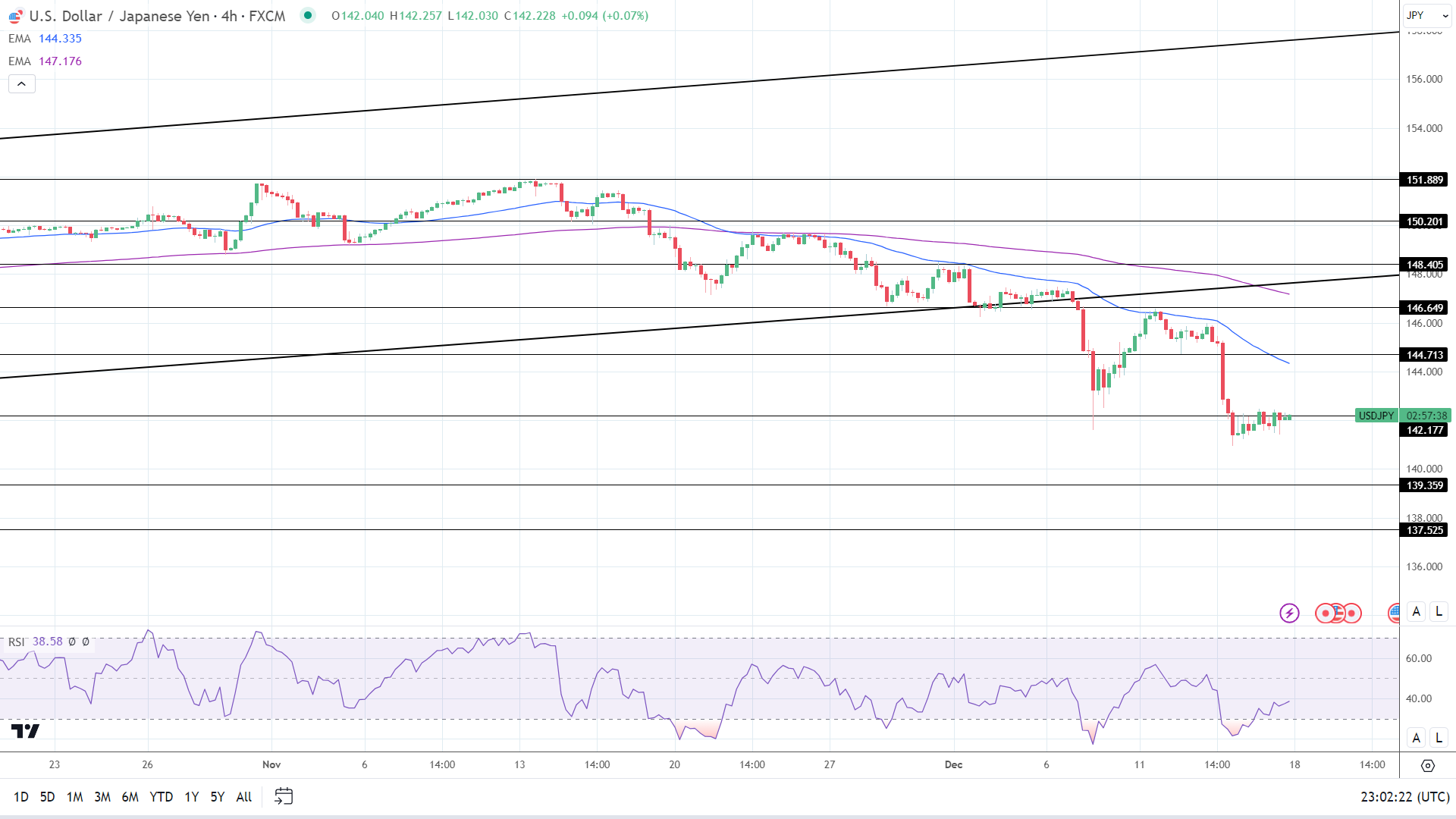 14周期4小时RSI为38.58,表明美元/日元在进入超卖区域之前跌至141.500关口。