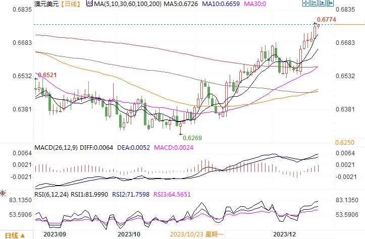 周二(12月19日),澳元/美元延续长期涨势继续冲高,当日收盘在0.6761,上涨0.79。澳洲央行12月份政策会议的会议记录显示,澳洲央行曾考虑在12月连续第二个月加息,但认为通胀方面有足够的鼓舞人心的迹象,因此需要暂停等待更多数据。市场在此次会议之后降低了对澳洲央行进一步加息的预期,在一定程度上也受美联储最近转向鸽派影响。期货市场走势显示,决策者在明年2月开会时再次加息的可能性为6%,明年年底前将降息两次。会议记录还显示,委员们还一致认为,澳洲央行目前持有公债至到期的做法仍然是适当的,但同意继续积极考虑提前出售债券的可能性。走势形态仍紧贴布林带通道上轨线呈上行趋向,各类技术指标仍保持上扬态势。显示澳元多头仍占优。目前下方初步支撑在0.6650附近,上方若进一步上攻的初步目标将瞄向0.6800。