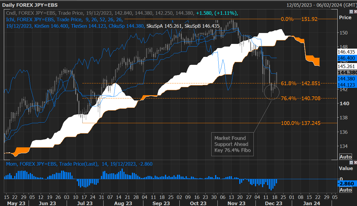 在日本央行周二宣布决议之前,美元/日元已经出现回升走势,随后加速反弹,攀升至过去九个交易日的中点的一目均衡转换线上方,目前一目均衡转换线切入位为144.12。如果日线收盘价高于日本广泛使用的这一技术水平,则可能出现更大的反弹。
