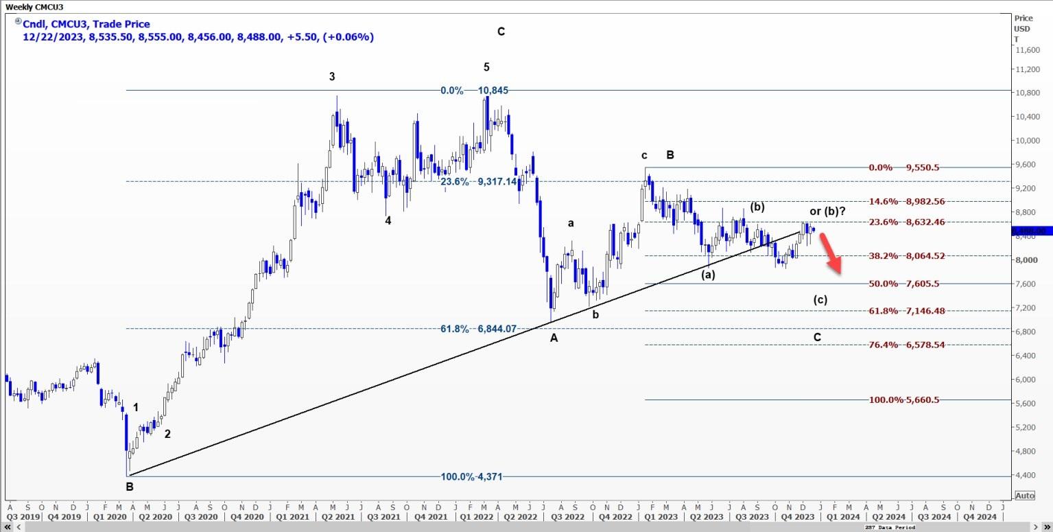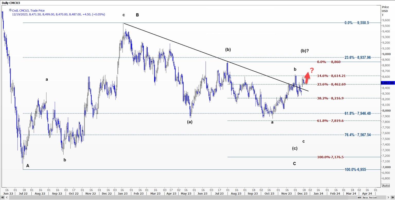 这样的突破将首先打开通往8860美元的道路,因为谨慎的假设是,向该水平的上涨可能是由于(b)浪的延伸。