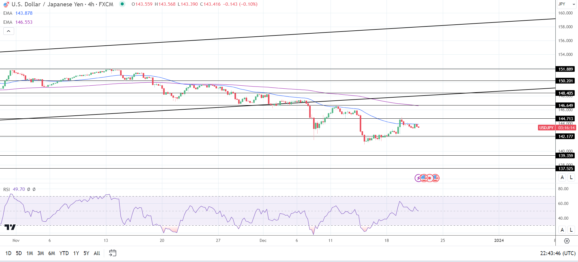 14周期4小时RSI为49.70,表明美元/日元在进入超卖区域之前会跌至142.177支撑位。