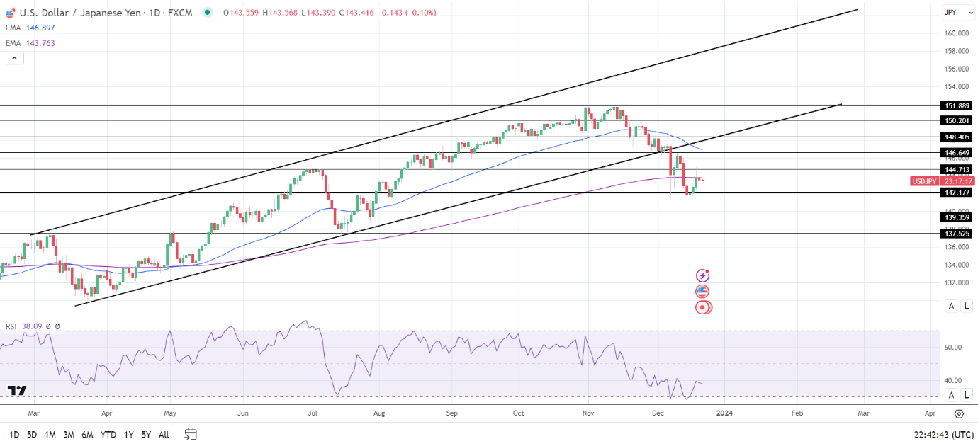 14天RSI为38.09,表明美元/日元在进入超卖区域之前会跌至142.177支撑位。