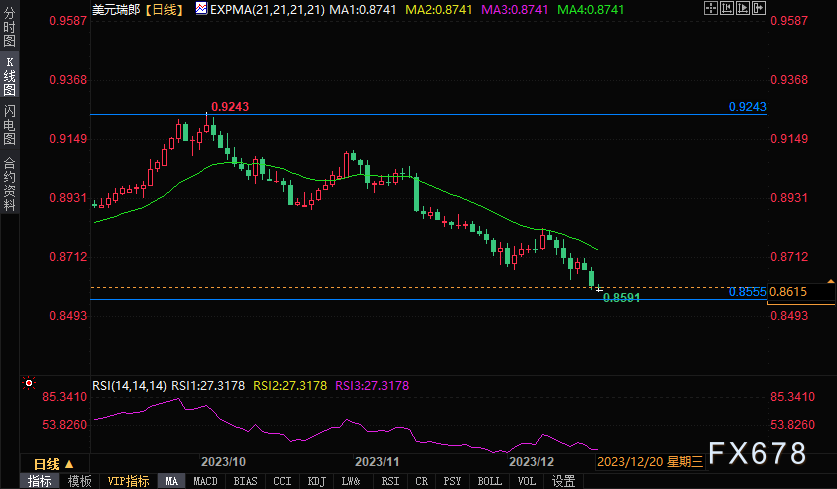 周三,(12月20日),欧盘时段,美元/瑞郎窄幅震荡,盘中报0.8612,涨幅0.05%。