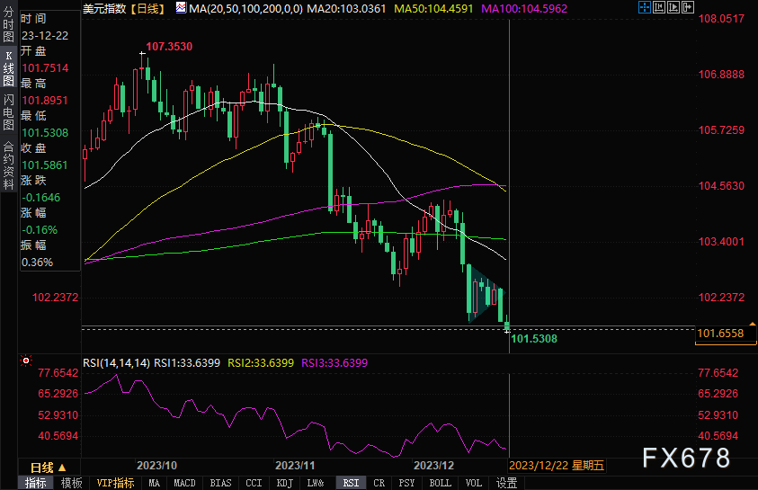 北京时间周五晚上22:30,美国11月核心个人消费支出数据公布,这是圣诞休市前的最后一个重量级数据。美国核心个人消费支出年率从3.5%降至3.2%,稍低于预期0.1%,利空美元。不过,加拿大10月季调后GDP数据不及预期支撑了美元。美元指数小幅走高后回落。