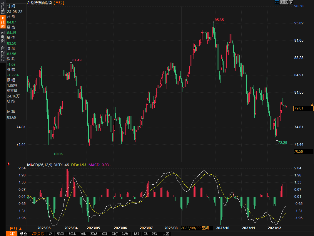 截至发稿,布伦特原油连续合约上涨0.33%,至79.06美元/桶,美原油连续合约跌1.79%,至73.75美元/桶。