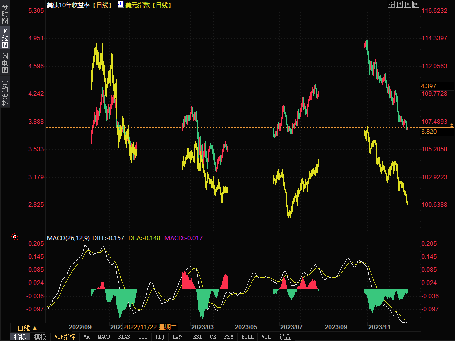 10年期美国国债收益率交易在3.820%,隔夜触及五个月低点。与此同时,两年期国债收益率跌至4.258%,而在10月份,该收益率曾高达5.295%。